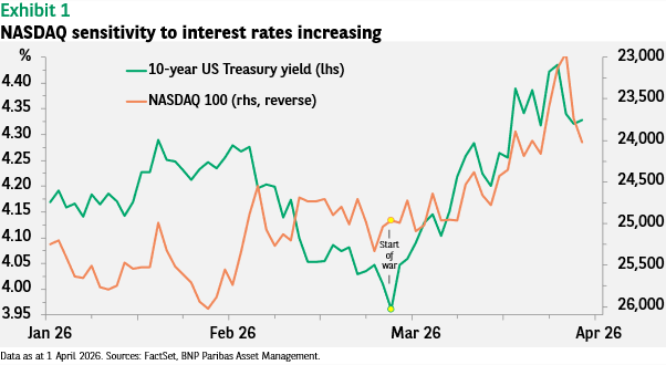 If negotiations to end the conflict do succeed, lower interest rates would likely spur a market rally. In our view the Federal Reserve’s relatively patient tone about the impact of higher oil prices on inflation, in contrast to a more reactive European Central Bank, provides further support for US equities.