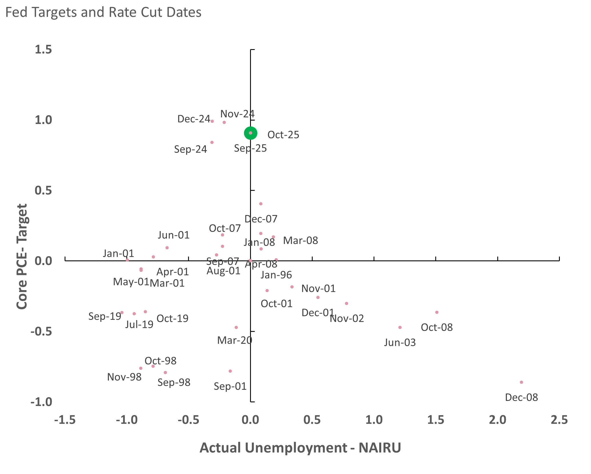 The modest shift in rate cut expectations has been one of timing. The magnitude remains unchanged, with the Fed Funds Rate expected to be at 3.0% by end-2026. It’s worth considering the risks to this expected rate path. For starters, it is not clear the current state of the US economy warrants further cuts. The Fed has a dual mandate – targeting both inflation and unemployment. Chart one encompasses that. The vertical axis plots actual inflation relative to the Fed’s core personal consumption expenditure deflator target of 2.0% (a mark above zero means inflation is higher than target). The horizontal axis does the same for unemployment with the Congressional Budget Office’s estimate of unemployment rate that is consistent with stable inflation (a mark below zero means unemployment is below that rate, i.e. the labour market is tight). The marks on the chart reflect where the economy was at each time the Fed has reduced interest rates since 1995.