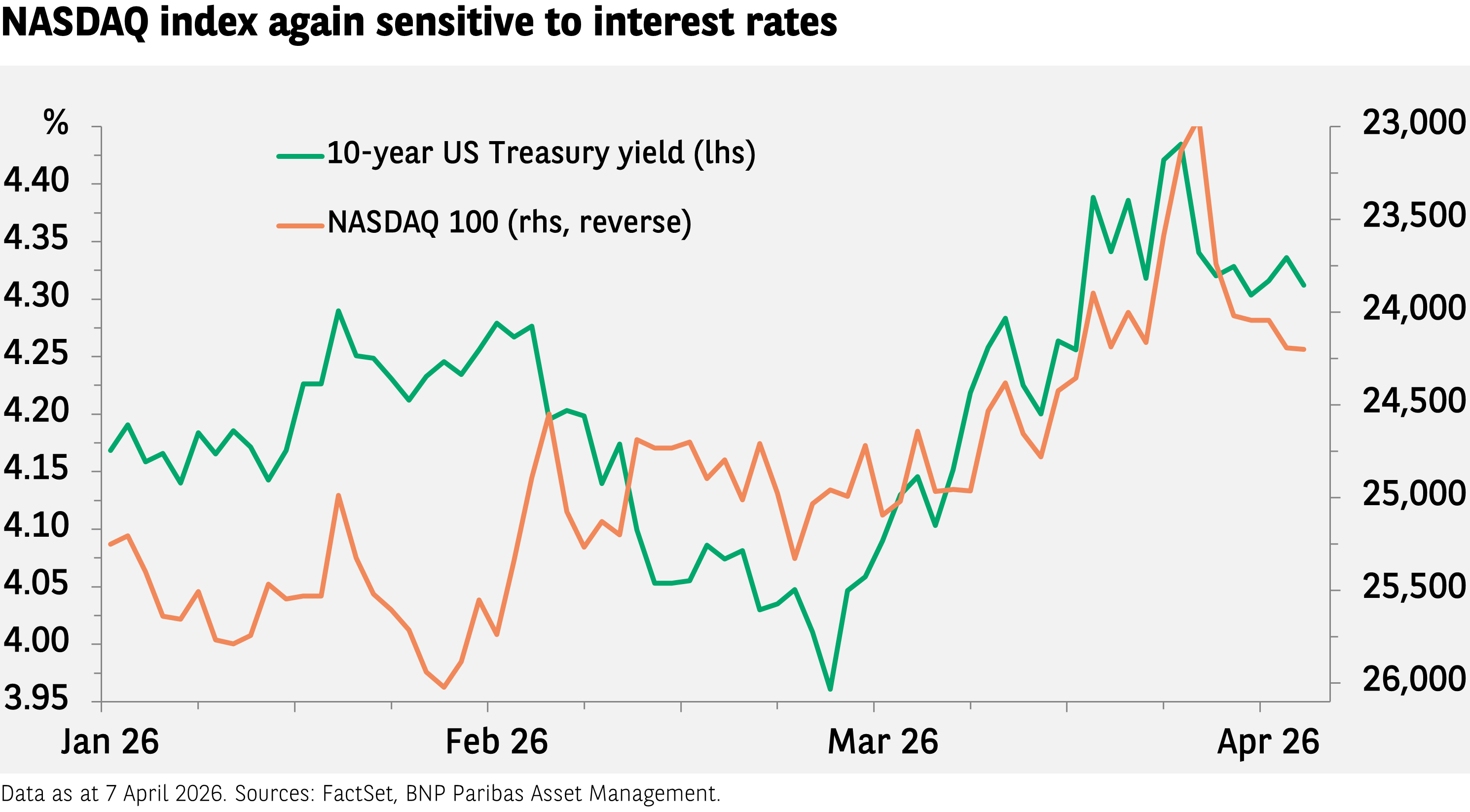 Corporate earnings are, of course, critical to the performance of technology stocks, but valuations also matter, and here interest rates play an important role. This was evident in 2022 when interest rates rose on the back of post-pandemic inflation, and the Nasdaq 100 fell sharply. Until recently, the technology-heavy index moved primarily based on the perceived impact on earnings from developments in artificial intelligence. Lately, as interest rates rose alongside inflation worries, the Nasdaq fell. If the situation in the Middle East continues to improve, interest rates could move back down, which should support the index.