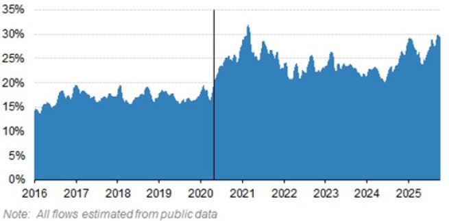 After six months without a daily correction of more than 2% for the S&P 500, equities endured a bout of volatility on 10 October when Trump took to social media to berate a hostile trade attitude from China relating to its actions on rare earths and export controls. In a classic Trump gesture, he first threatened a massive increase in tariffs on Chinese products, only to finally appease markets later by confirming he will be meeting President Xi Jinping in South Korea -  the first time since Trump returned to the White House. As tariff uncertainty made a comeback, the positioning reduction from volatility-controlled strategies and discretionary investors was well absorbed by the market judging by the limited losses on the S&P 500. This is especially important considering the return to a higher volatility regime also triggered some profit taking in high-momentum trades which have been retail favourites since the market rally began in late April.