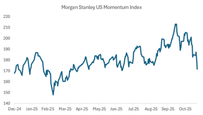 Although difficult to rigorously quantify, we believe Bitcoin’s severe correction (-33% from early October to late November) and other crypto assets may have contributed to the rise in risk aversion in the equity market. Indeed, even if only 0.4% of institutional cash is invested in such crypto assets (according to the Bank of America November 2025 Fund Manager Survey), US retail investors are more heavily exposed. This may have deprived listed markets of the usual retail dip buyers who have been unseasonally absent in recent weeks. If anything, we take comfort that retail-favoured ‘momentum’ stocks - those which have had a positive price change relative to the market - seem to have troughed at a depressed level, consistent with previous instances earlier this year.